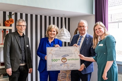 De minister reikte het 500e certificaat Milieuthermometer Zorg uit aan Teunis Stoop (bestuurder) en Annet Schneider (duurzaamheidscoördinator) van ouderenzorgorganisatie Cedrah: een mijlpaal. De Milieuthermometer Zorg is een gangmaker voor duurzame zorg.