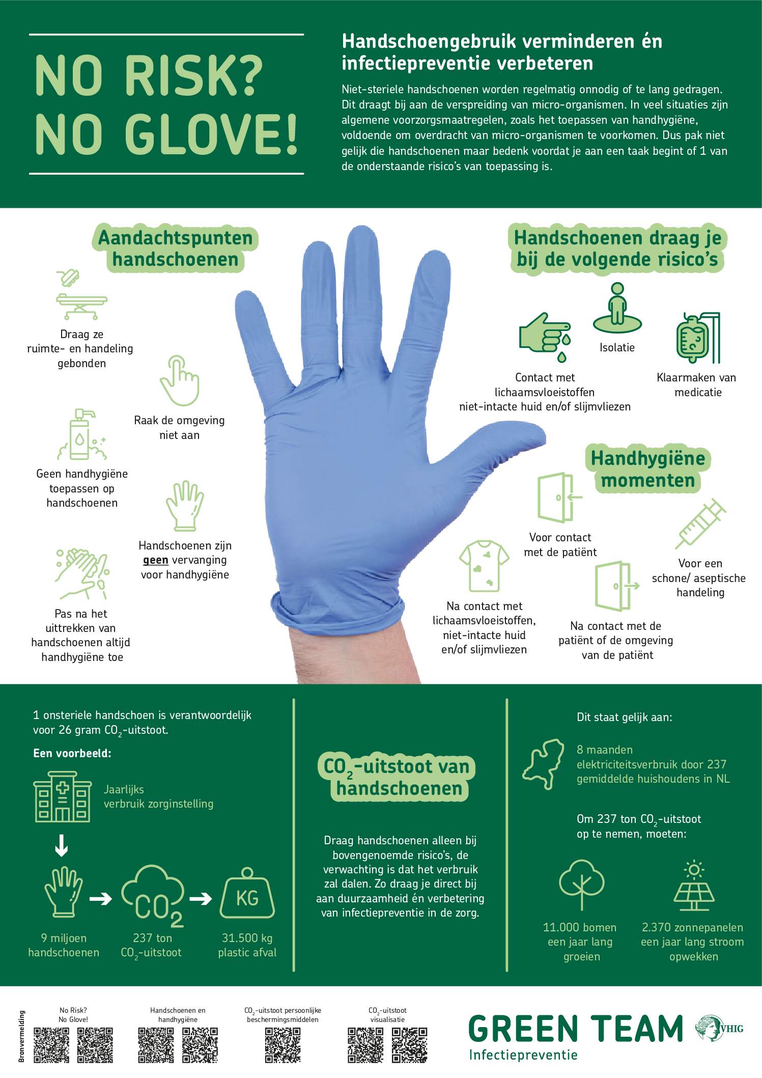 Eén niet-steriele handschoen is verantwoordelijk voor 26 gram CO2 (Green Team Infectiepreventie NL, onderdeel van de VHIG). Minimalisatie van handschoenengebruik scheelt CO2, (fossiele) grondstoffen en kosten.