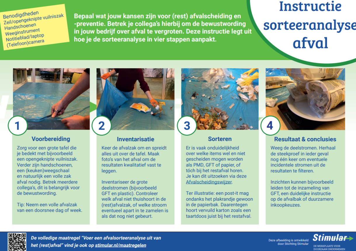 Om je mogelijkheden voor afvalscheiding en -preventie in kaart te brengen kun je een afvalsorteeranalyse (laten) uitvoeren van het restafval. Hiermee krijg je inzicht in wat de kwaliteit is van de huidige afvalscheiding, inventariseer je potentiële afvalstromen om aanvullend te scheiden, identificeer je kansen voor afvalpreventie en creëer je draagvlak onder medewerkers voor afvalmaatregelen.