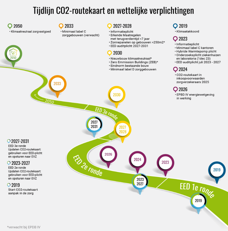 Zorgorganisaties met een EED-auditplicht of die lid zijn van een brancheorganisatie in de zorg (ActiZ, de Nederlandse ggz, VGN, NFU of NVZ) moeten in ieder geval een CO₂-routekaart opstellen.