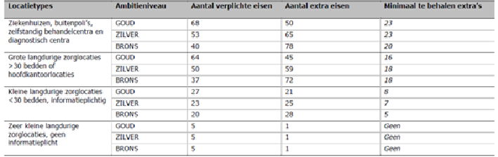 Daarnaast zijn een aantal extra eisen gedefinieerd. Deze zijn niet verplicht, maar er moeten wel een aantal extra eisen worden behaald. Organisaties kunnen hierin wel zelf een keuze maken. Grote zorgorganisaties voor langdurige zorg op niveau brons moeten bijvoorbeeld aan 20 extra eisen voldoen. Hiervoor kan een keuze worden gemaakt uit in totaal 78 extra eisen.